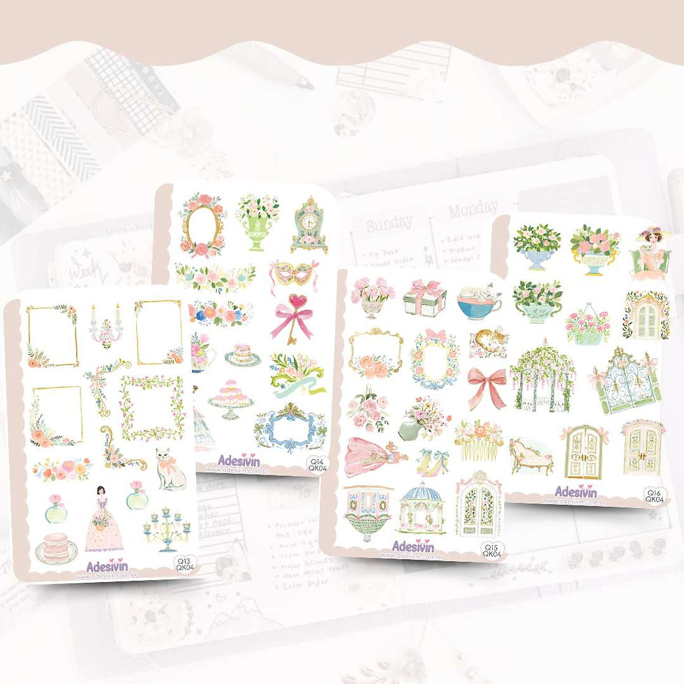 A coleção Quarteto possuí 4 cartelas do mesmo tema, os adesivos tem tamanhos variados.